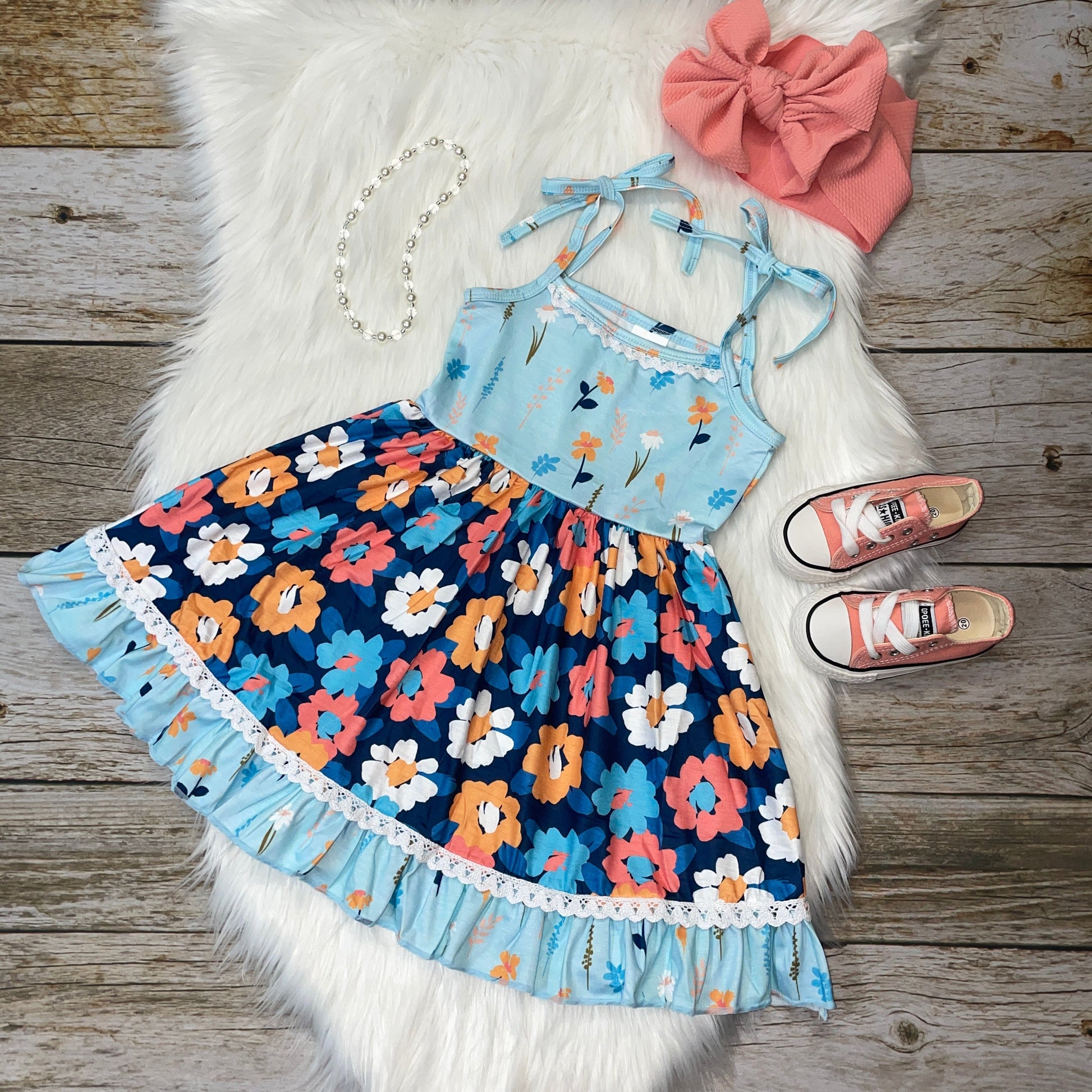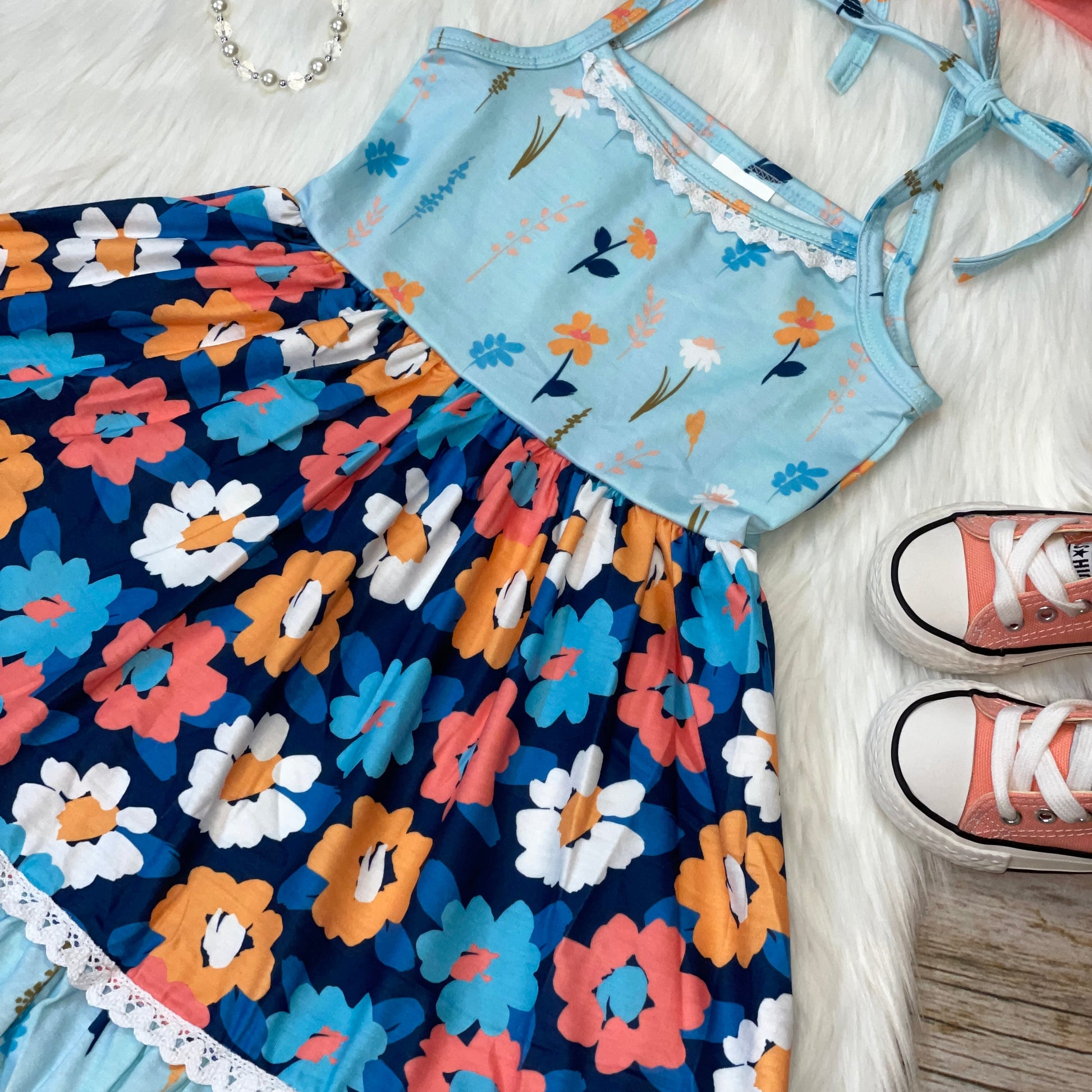 Blue and Coral Lace Trimmed Floral Dress with Shoulder Ties