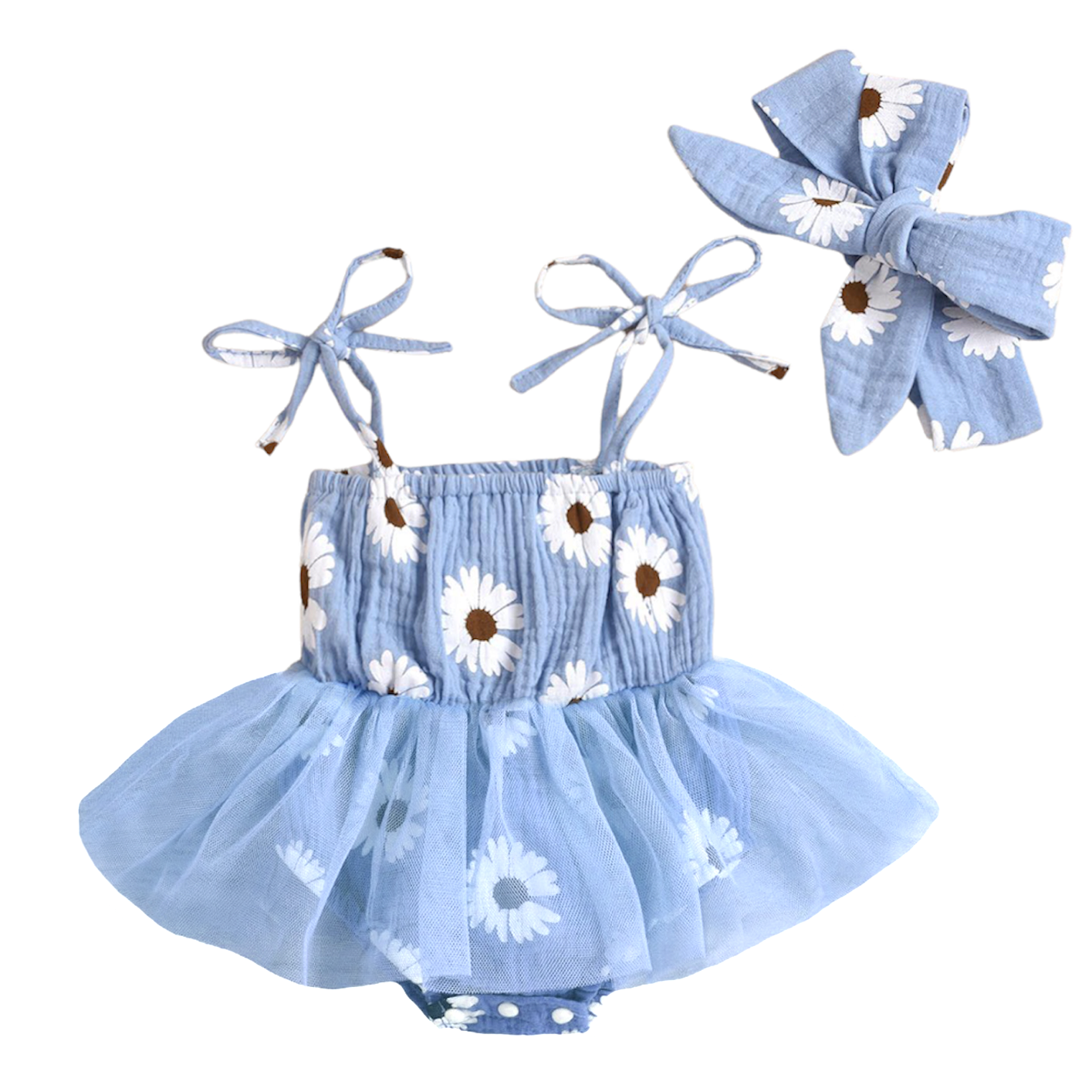 Blue Muslin Daisy Printed Skirted Bubble with Headwrap
