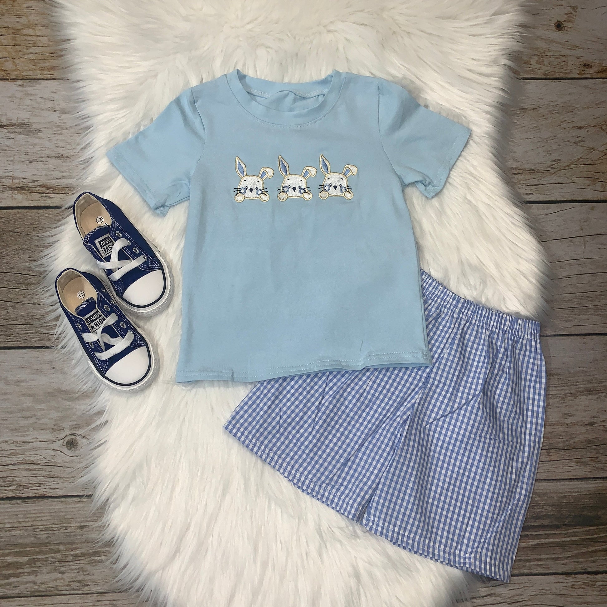 Light Embroidered Easter Bunny Tee & Blue Checkered Shorts Set