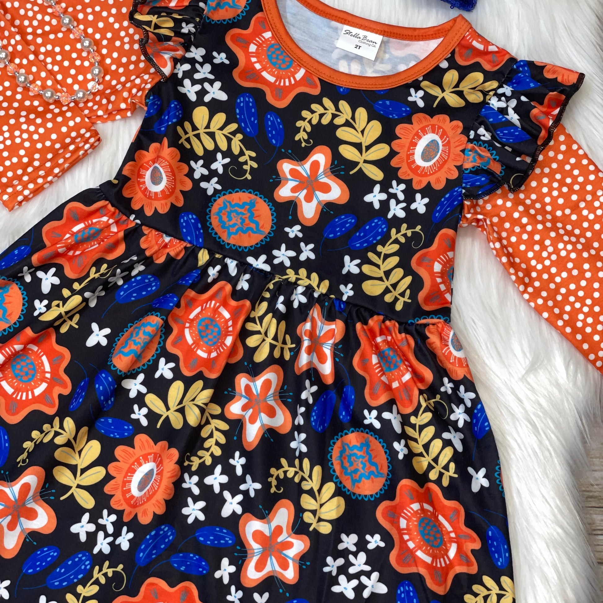 Orange & Blue Floral Flutter Sleeve Dress with Polka Dot Sleeves