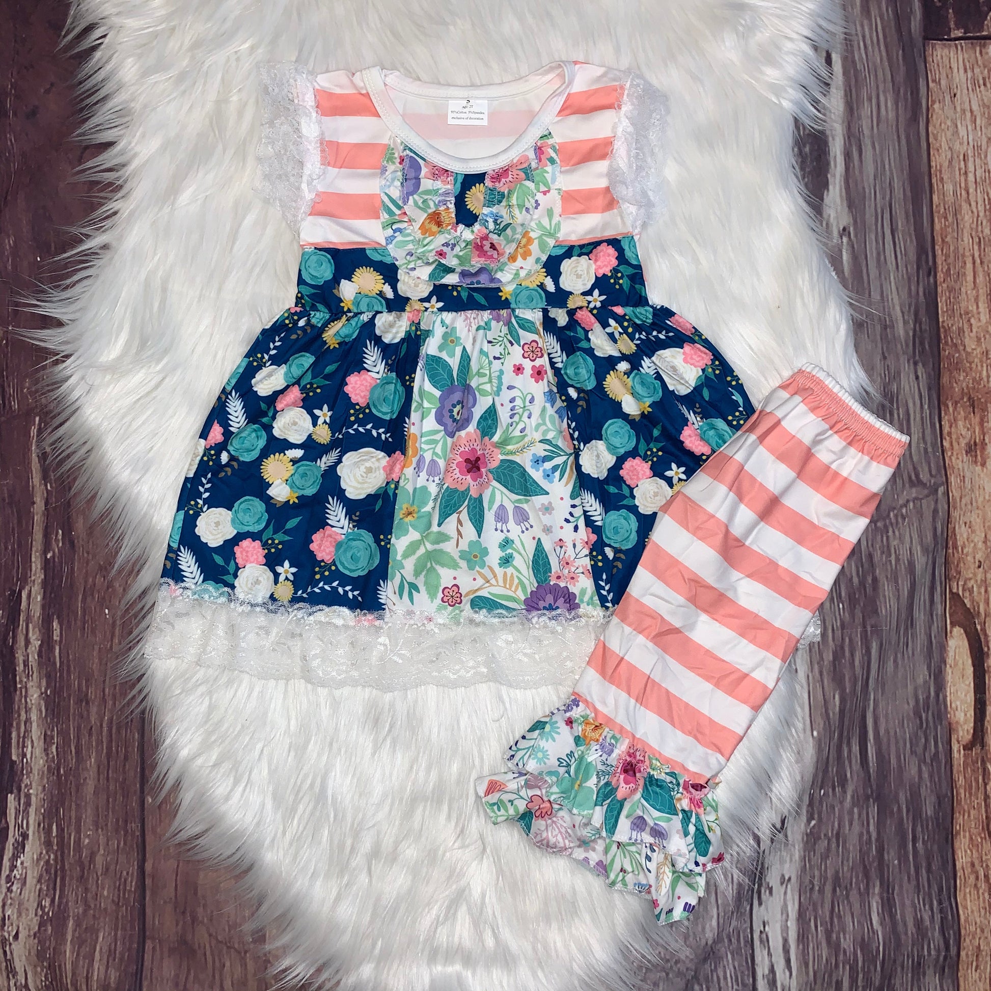 Peach & Floral Damask Lace Trim Tank with Stripe Ruffle Capris